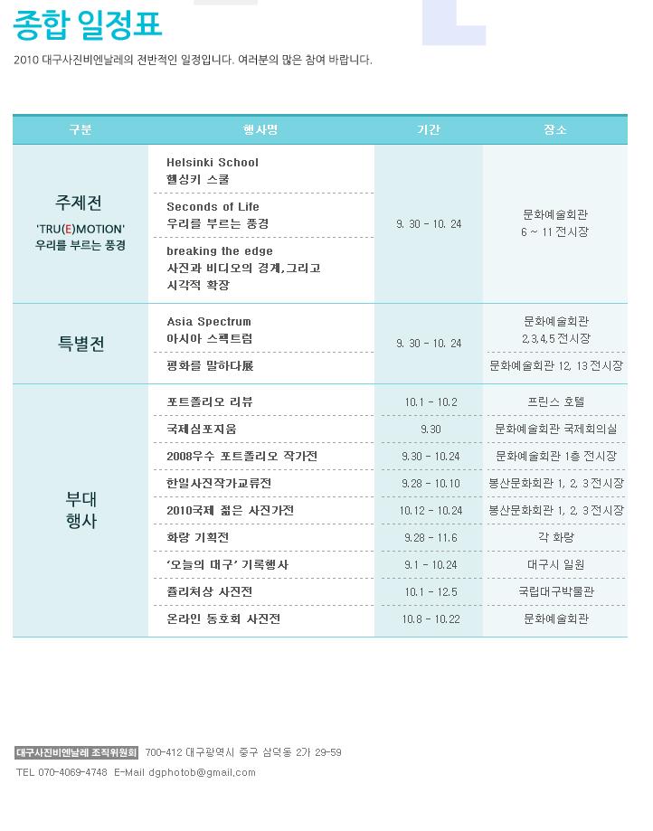 2010 ´ë±¸»çÁøºñ¿£³¯·¹ÀÇ ÁÖÁ¦°¡ µÈ ´Ü¾î´Â Àΰ£°ú Àΰ£À» µÑ·¯½Ñ dz°æ »çÀÌÀÇ °ü°è¸¦ ´Ù°¢µµ·Î Á¶¸ÁÇØ º¸´Âµ¥, ¼¼ °³ÀÇ ¼ÒÁÖÁ¦-Seconds of Life Àΰ£ÀÌ ¸¸µç dz°æ, Helsinki School Çï½ÌŰ½ºÄð, Breaking the edge »çÁø°ú ºñµð¿ÀÀÇ °æ°è, ±×¸®°í ½Ã°¢Àû È®Àå-·Î ³ª´µ¾î Àü½ÃµÉ ¿¹Á¤ÀÌ´Ù. 2010 ´ë±¸»çÁøºñ¿£³¯·¹ ¿ª½Ã ´Ù¸¥ Áö¿ªÀÇ ºñ¿£³¯¶ó¿Í °øÅëÁ¡À» º¸À̰í ÀÖ´Â °ÍÀÌ ¹Ù·Î ¾Æ½Ã¾ÆÀÇ ÀÛǰÀ» Ưº°Àü Çü½ÄÀ¸·Î Àü½ÃÇϰí ÀÖ´Ù´Â °ÍÀÌ´Ù. '¾Æ½Ã¾Æ ½ºÆåÆ®·³'À̶ó´Â Ưº°ÀüÀº ÀÌ Àü½Ãȸ¸¦ ÅëÇØ Çѱ¹°ú Áß±¹, ÀϺ»À» ºñ·ÔÇØ Àεµ, ¸»·¹À̽þÆ, ű¹ µî ¾Æ½Ã¾Æ 11°³±¹ÀÇ »çÁøÀÛ°¡ 30¿© ¸íÀ» Âü°¡ÇÏ¿©, ¾Æ½Ã¾ÆÀÇ °ú°Å¿Í ÇöÀç, ±×¸®°í ¹Ì·¡´Â ¹°·Ð ¾Æ½Ã¾Æ ƯÀ¯ÀÇ »ö±òÀÌ ¾î¶»°Ô »çÁø¿¡ Åõ¿µµÇ´ÂÁö º¸¿©ÁØ´Ù.