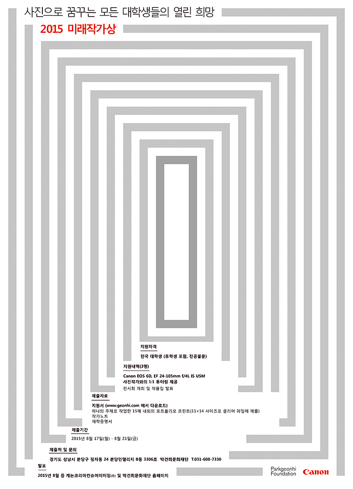 2015³â¿¡ ¼±Á¤µÉ 3¸íÀÇ ¹Ì·¡ÀÛ°¡»ó ¼ö»óÀÚµéÀº ij³í ¡®EOS 6D¡¯¿Í ¡®EF 24-105mm f/4L IS USM¡¯ ·»Áî µî Àåºñ¸¦ Áö±Þ¹Þ°í, Àü¹® »çÁø°¡ÀÇ Æ©Å͸µÀ» Á¦°ø¹Þ´Â´Ù. ¶ÇÇÑ ±³À° ÈÄ¿¡´Â Àü½Ã ¹× ÀÛǰÁý ÃâÆÇÀ» ÅëÇØ ±× µ¿¾ÈÀÇ ¼ºÀåÀ» È®ÀÎÇÒ ¼ö ÀÖ´Â ±âȸ°¡ ÁÖ¾îÁø´Ù. ¡®2015 ¹Ì·¡ÀÛ°¡»ó¡¯Àº Àü°ø¿¡ »ó°ü¾øÀÌ ±¹³»ÀÇ ´ëÇлýÀ̶ó¸é ´©±¸³ª Âü°¡ÇÒ ¼ö ÀÖÀ¸¸ç, Áö¿ø¼¿Í ÇÔ²² ÇϳªÀÇ Å׸¶·Î ÀÛ¾÷ÇÑ 15¸Å ³»¿Ü ºÐ·®ÀÇ Æ÷Æ®Æú¸®¿À¿Í ÀçÇÐÁõ¸í¼¸¦ ¹Ú°ÇÈñ¹®ÈÀç´ÜÀ¸·Î Á¢¼öÇÏ¸é µÈ´Ù.