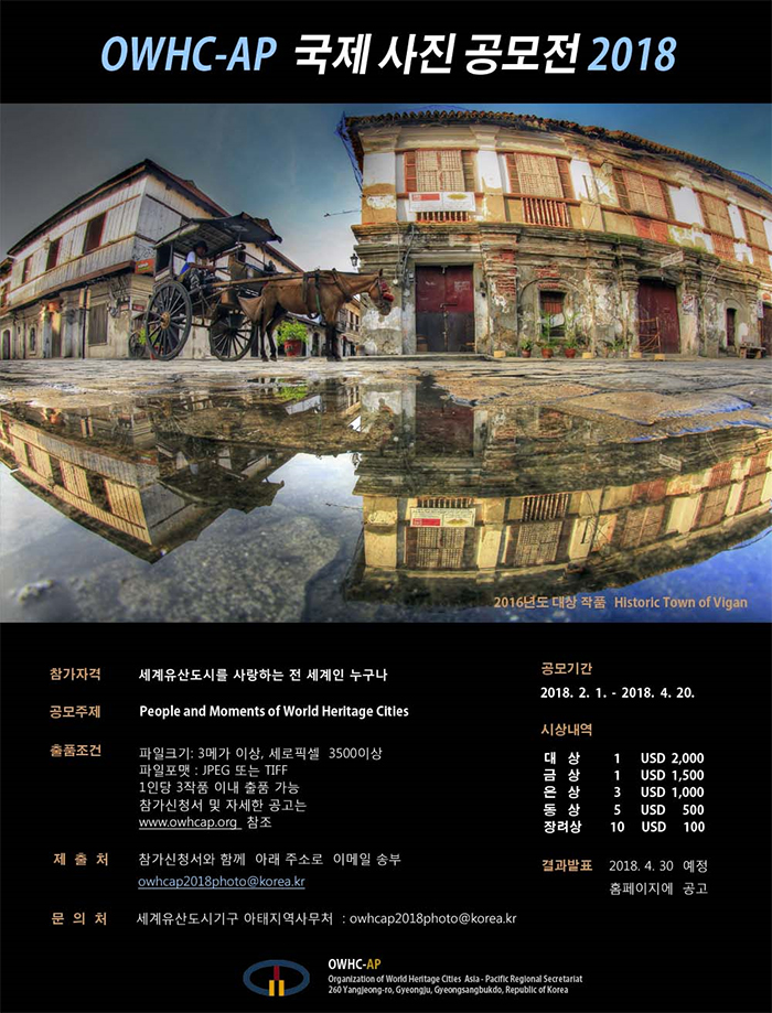 À¯³×½ºÄÚ ¼¼°èÀ¯»ê(¹®ÈÀ¯»ê)ÀÌ ¼ÒÀçÇÑ µµ½ÃÀÇ ±¹Á¦ÇùÀÇü ¼¼°èÀ¯»êµµ½Ã±â±¸(Organization of World Heritage Cities)ÀÇ ¾Æ½Ã¾Æ¡¤ÅÂÆò¾çÁö¿ª »ç¹«Ã³ÀÎ OWHC-AP¿¡¼ ±¹Á¦»çÁø°ø¸ðÀüÀ» °³ÃÖÇÕ´Ï´Ù. ¼¼°èÀ¯»êµµ½Ã¿¡¼ »ì¾Æ°¡´Â »ç¶÷µé°ú ¹®ÈÀ¯»êÀÇ °øÁ¸, ±× ¾Æ¸§´Ù¿î ¼ø°£À» ±â´Ù¸³´Ï´Ù. ¸¹Àº Âü¿© ºÎʵ右´Ï´Ù.