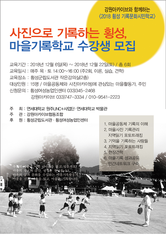 °¿ø¾ÆÄ«À̺꿡¼´Â Áö¿ª¼º º¹¿ø°ú Áö¼Ó°¡´ÉÇÑ °øµ¿Ã¼ Ä¿¹Â´ÏƼ Ȱ¼ºÈ¸¦ À§ÇÑ ±â·Ï¹®È½Ã¹ÎÇб³ Á¦5±â ÁÖÁ¦º° ½Çõ±³À°À¸·Î ¡®È¾¼º ¸¶À»±â·ÏÇб³¡¯¸¦ °³°ÇÑ´Ù. ¿¬¼¼´ëÇб³ ¿øÁÖLINC+»ç¾÷´Ü°ú ¿¬¼¼´ë ¹Ú¹°°üÀÌ ÁÖÃÖÇÏ°í °¿ø¾ÆÄ«À̺꿡¼ ÁÖ°üÇÏ´Â ¸¶À»±â·ÏÇб³´Â Ⱦ¼ºÁö¿ªÀÇ ÁֹεéÀ» ´ë»óÀ¸·Î 2018³â 12¿ù 6ÀϺÎÅÍ 22ÀϱîÁö Ⱦ¼º±º¸³µµ¼°ü¿¡¼ ÁøÇàµÈ´Ù.