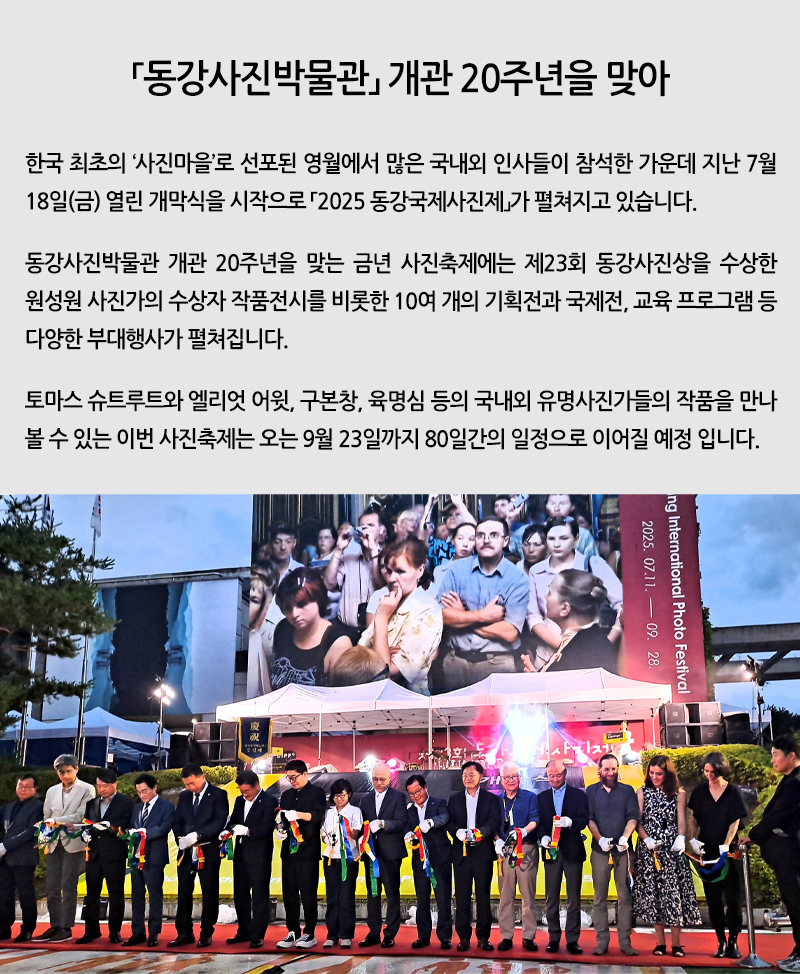 Çѱ¹ ÃÖÃÊÀÇ ¡®»çÁø¸¶À»¡¯·Î ¼±Æ÷µÈ ¿µ¿ù¿¡¼ ¸¹Àº ±¹³»¿Ü ÀλçµéÀÌ Âü¼®ÇÑ °¡¿îµ¥ Áö³ 18ÀÏ ¿¸° °³¸·½ÄÀ» ½ÃÀÛÀ¸·Î ¡¸2025 µ¿°±¹Á¦»çÁøÁ¦¡¹°¡ ÆîÃÄÁö°í ÀÖ½À´Ï´Ù.