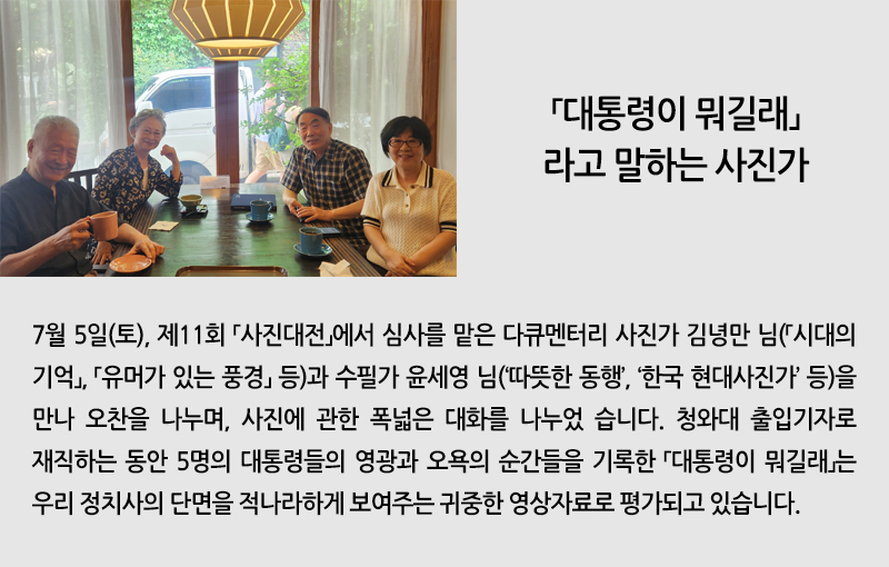 7¿ù 5ÀÏ, Çѱ¹»çÁø¿¹¼ú¿ø(¿øÀå ÀÓÇâÀÚ)ÁÖÃÖ Á¦11ȸ ¡¸»çÁø´ëÀü¡¹¿¡¼ ½É»ç¸¦ ¸ÃÀº ´ÙÅ¥¸àÅ͸® »çÁø°¡ ±è³ç¸¸ ´Ô(¡¸½Ã´ëÀÇ ±â¾ï¡¹, ¡¸À¯¸Ó°¡ Àִ dz°æ¡¹ µî)°ú ¼öÇʰ¡ À±¼¼¿µ ´Ô(¡®µû¶æÇÑ µ¿Ç࡯, ¡®Çѱ¹Çö´ë»çÁø°¡¡¯ µî)À» ¸¸³ª ±è½Â°ï±³¼ö´Ô°úÇÔ²² ¿ÀÂùÀ» ³ª´©¸ç, »çÁø¿¡ °üÇÑ Æø³ÐÀº ´ëȸ¦ ³ª´©¾ú½À´Ï´Ù.