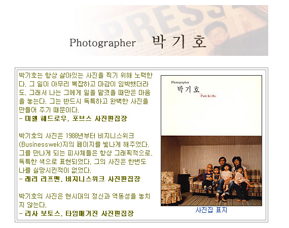 »çÁø°¡ ¹Ú±âÈ£´Â 1960³â ¼¿ï Ãâ»ýÀ¸·Î 1973³â µµ¹Ì(Ô¤Ú¸). 1983³â ¸Þ¸±·£µå ÁÖ¸³´ëÇб³¿¡¼ °æÁ¦Çаú¸¦ ¼ö·áÇßÀ¸¸ç, Rhode island School of Design¿¡¼ »çÁøÇаú¸¦ Á¹¾÷Çß´Ù. Bruce DavisonÀÇ Assistant·Î ¹ßŹµÇ¾î 2³â µ¿¾È ¾Ö´º¾ó¸®Æ÷Æ® ¹× ÀâÁö¿Í Bruce DavisonÀÇ ´ëÇ¥ÀÛÀÎ 'Subway'ÀÛ¾÷¿¡ Âü¿©Çß´Ù. Á¹¾÷ÈÄ¿¡´Â Epstien Gutzwiller & partner¿¡¼ »çÁø´ã´ç Director·Î¼ ÀÏÇßÀ¸¸ç, 1987³â 'Newsweek'ÁöÀÇ Çѱ¹ÆÄ°ß »çÁø±âÀÚ·Î ±Í±¹Çß´Ù. ÇöÀç 'Ű½ºÅæ »çÁø¿¬±¸½Ç'´ëÇ¥·Î ÀÖÀ¸¸ç Áß¾Ó´ëÇб³ ´ëÇпø »çÁøÇаú¿¡ Ãâ°ÁßÀÌ´Ù. Businessweek, Fortune, Time, Forbes, GEOÀÇ Çѱ¹ÆÄ°ß »çÁø±âÀڷμ Asia Specialist·Î Ȱµ¿Çϰí ÀÖÀ¸¸ç ±¹³»¿Ü Annual Report, ±¤°í ÀâÁö µîÀÇ ´Ù¾çÇÑ ÀÛ¾÷À» Çϰí ÀÖ´Ù.