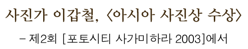 ±Ý³â Á¦2ȸ ¡¸µ¿°»çÁøÃàÀü¡¹¿¡¼ ±¹³» ÀÛ°¡»óÀ» ¼ö»óÇÑ À̰©Ã¶(»çÁø°¡)¿¡°Ô °ã°æ»ç°¡ ³µ´Ù. ÀϺ» »ç°¡¹ÌÇ϶ó(ßÓÙ¼ê«) ½Ã°¡ ÁÖÃÖÇÏ´Â Á¦2ȸ ¡¸Æ÷Åä½ÃƼ »ç°¡¹ÌÇ϶ó 2003¡¹¿¡¼ ¡¸Ãæµ¹°ú ¹Ýµ¿¡¹À¸·Î <¾Æ½Ã¾Æ »çÁø»ó>À» ¼ö»óÇÏ°Ô µÈ °Í. µµÄì¿¡¼ ¾à 40km Á¤µµ ¶³¾îÁø »ç°¡¹ÌÇ϶ó ½Ã´Â 21¼¼±â¸¦ ¸Â´Â Ã¹ÇØÀÎ 2001³â ÀÌ »çÁøÃàÁ¦¸¦ â¼³Çߴµ¥, <¾Æ½Ã¾Æ »çÁø»ó>Àº À۳⿡ ÀÌ¾î µÎ ¹øÂ°·Î ½Ç½ÃµÈ °ÍÀ¸·Î, ³ÐÀº ÀǹÌÀÇ ±â·ÏÀûÀÎ »çÁøºÐ¾ß¿¡¼ Ź¿ùÇÑ ÀÛǰÀ» Á¦ÀÛ ¹ßÇ¥ÇÑ ¾Æ½Ã¾ÆÀÇ Áß°ß »çÁø°¡¿¡°Ô ¼ö¿©µÈ´Ù.