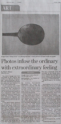»çÁøµéÀº ÀÏ»óÀûÀÎ °Í¿¡ ºñÀÏ»óÀû ´À³¦À» ºÒ¾î ³Ö´Ù. - Alan G. Artner / Chicago Tribune ¿¹¼úºñÆò°¡Andrew Bae°¶·¯¸®¿¡¼ óÀ½À¸·Î ½ÃÄ«°í¿¡ ¼±º¸ÀÌ´Â ÀÌÁ¤Áø Àü½ÃÀÇ Å¸ÀÌÆ²Àº " »çÁø ³Ê¸Ó¿¡"ÀÌ´Ù. ÀÌ Á¦¸ñÀº ¸ð¸£°í ÀÖ´Â ¾î¶² °ÍÀ» ¾Ï½ÃÇÒ °Í¸¸ °°Àº ¸Ó³ª¸Õ °÷À¸·Î ¿ì¸®¸¦ µ¥·Á °¡Áö¸¸, Áö±Ý ¿©±â ¿ì¸® ¾Õ¿¡ º¸¿©Áö´Â °ÍÀº Ä£±ÙÇÑ °ÍµéÀÌ´Ù.