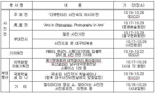 ¶ÇÇÑ ¹Ì¼úÀ» ±â¹ÝÀ¸·Î ÇÑ ÀÛ°¡µéÀÇ °¨°¢ ÀÖ´Â »çÁøÀÛ¾÷°ú »çÁøÀ» Àü°øÇÑ ÀÛ°¡µéÀÇ Á¤ÅëÀûÀÎ »çÁøÀÛ¾÷À» ºñ±³ Àü½ÃÇÏ¿© »çÁøÀÇ ¿µ¿ªÀ» È®ÀåÇϰí Çѱ¹»çÁøÀÇ ÇöÁÖ¼Ò¸¦ Áø´ÜÇÒ ¼ö Àִ Ưº° Àü ¡®Arts in Photography, Photo in Arts¡¯î÷ÀÌ ¹®È¿¹¼úȸ°ü¿¡¼ °³ÃֵǸç, 1950³â ÀÌÈÄ ÇâÅäÀÇ Ç³¹°, »î, º¯Ãµ»ç¸¦ »çÁøÀ¸·Î »ìÆìº¸¸ç ´ë±¸ÀÇ »çÁøÀÇ Á¤Ã¼¼ºÀ» ÀçÈ®ÀÎ ÇØº¸´Â¡¸»çÁøÀ¸·Î º» ´ë±¸ 50³â»ç¡¹¿Í 40¼¼ ¹Ì¸¸ ±¹³»¿Ü û³âÀÛ°¡µéÀÌ Âü¿©ÇÏ¿© ¹Ì·¡ÀÇ »çÁø¹æÇâÀ» Á¦½ÃÇϴ¡¸ÀþÀº »çÁø°¡Àü¡¹¡¸¸ÖƼ¹Ìµð¾î ¿µ»ó¼î¡¹, ÁöÇÏö¿ª, °ø¿ø µî¿¡¼ Àü½ÃµÇ´Â¡¸Ã£¾Æ°¡´Â »çÁøÀü¡¹µî°ú ±¹³»¿Ü À¯¸íÀÛ°¡, ±³¼ö µîÀÌ Âü¿©ÇÏ¿© ÇâÈÄ ´ë±¸»çÁøºñ¿£³¯·¹ÀÇ ¹æÇâÀ» Á¦½ÃÇÒ ±¹Á¦Çмú´ëȸµµ °³ÃÖ µÉ ¿¹Á¤ÀÌ´Ù