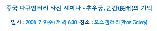 30¿© ³â µ¿¾È ´ÙÅ¥¸àÅ͸® »çÁøÀÛ¾÷À» ÇÏ¸é¼ Áß±¹ ³»´Â ¹°·Ð ÇØ¿Ü¿¡¼µµ Áö¸íµµ°¡ ³ôÀº ¿ø·Î»çÁø°¡ ÈÄ¿ì±ÃÀÇ ÀÛ°¡ Ư°ÀÌ 2008³â 7¿ù 9ÀÏ(¼ö) Àú³á 6½Ã30ºÐºÎÅÍ Á¾·Î±¸ °ü¼öµ¿¿¡ À§Ä¡ÇÑ <Æ÷½º°¶·¯¸®>¿¡¼ ¿¸°´Ù.