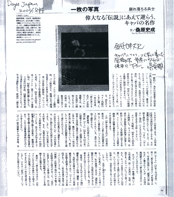 ±× »çÁøÀÌ ¡®ºß¡¯¿¡ °ÔÀçµÇ°í 10°³¿ù ÈÄ, À̹ø¿¡´Â ¡®¶óÀÌÇÁ¡¯(1937³â 7¿ù 12ÀÏÀÚ)¿¡ °°Àº »çÁøÀÌ ÀüÀçµÇ¾ú´Ù. »çÁø ¼³¸í¿¡´Â ¡®Àû±ºÀÇ ÃÑź¿¡ ¾²·¯Áö´Ù¡¯·Î µÇ¾î ÀÖ¾úÁö¸¸, ±× ÈÄ¿¡´Â ¡®¾²·¯Áö´Â º´»ç¡¯·Î ¹Ù²î¾î ÀÖ¾ú´Ù. °°Àº ¡®¶óÀÌÇÁ¡¯ ÁöÀÇ Àü¼Ó »çÁø°¡¿´´ø ¹ÌŰ ÁØÀº Ä«ÆÄ°¡ »ì¾Æ ÀÖÀ» ¶§ ÀÚ½ÅÀÇ ¡®¸íÀÛ¡¯ »çÁø¿¡ °üÇØ¼ º°·Î ¸»ÇÏ°í ½Í¾î ÇÏÁö ¾Ê¾Ò´Ù°í ÇÑ´Ù.