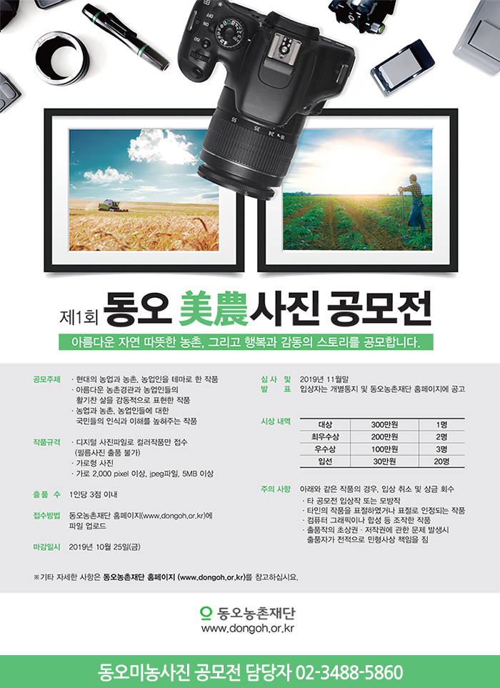 ¡®³ó¾÷±â¼úÀÇ ¼±ÁøÈ¿Í ³óÃ̹®ÈÀÇ ÁøÈÀ» ¸ñÇ¥·Î ¼³¸³µÈ µ¿¿À³óÃÌÀç´Ü(ÀÌ»çÀå À̺´¸¸)ÀÌ ¡°Á¦1ȸ µ¿¿ÀÚ¸ÒÜ»çÁø °ø¸ðÀü¡±À» °³ÃÖÇÑ´Ù. »çÁø°ø¸ðÀüÀÇ ÁÖÁ¦´Â ¡°ÀÚ¿¬°ú ³óÃÌÀÇ °¨µ¿ ½ºÅ丮¡±·Î¼ ¡âÇö´ëÀÇ ³ó¾÷°ú ³óÃÌ, ³ó¾÷ÀÎÀ» Å׸¶·Î ÇÑ ÀÛǰ ¡â¾Æ¸§´Ù¿î ³óÃ̰æ°ü°ú ³ó¾÷ÀεéÀÇ È°±âÂù »îÀ» °¨µ¿ÀûÀ¸·Î Ç¥ÇöÇÑ ÀÛǰ ¡â³ó¾÷°ú ³óÃÌ, ³ó¾÷Àε鿡 ´ëÇÑ ±¹¹ÎµéÀÇ Àνİú ÀÌÇØ¸¦ ³ôÇôÁÖ´Â ÀÛǰÀ» °ø¸ðÇϰí ÀÖ´Ù.