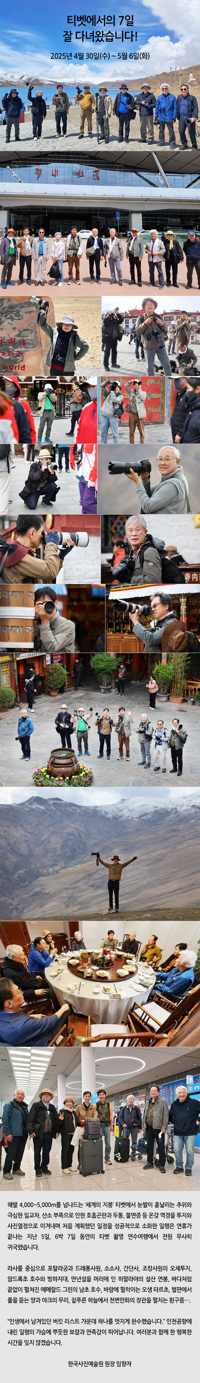 ÇØ¹ß 4,000~5,000m¸¦ ³Ñ³ªµå´Â ¡®¼¼°èÀÇ ÁöºØ¡¯ Ƽºª¿¡¼ ´«¹ßÀÌ È𳯸®´Â ÃßÀ§¿Í ±Ø½ÉÇÑ Àϱ³Â÷, »ê¼Ò ºÎÁ·À¸·Î ÀÎÇÑ È£Èí°ï¶õ°ú µÎÅë, ºÒ¸éÁõ µî ¿Â°® ¿ª°æÀ» ÅõÁö¿Í »çÁø¿Á¤À¸·Î À̰ܳ»¸ç óÀ½ °èȹÇß´ø ÀÏÁ¤À» ¼º°øÀûÀ¸·Î ¼ÒÈÇÑ ÀÏÇàÀº ¿¬ÈÞ°¡ ³¡³ª´Â Áö³ 5ÀÏ, 6¹Ú 7ÀÏ µ¿¾ÈÀÇ Æ¼ºª ÃÔ¿µ ¿¬¼ö¿©Çà¿¡¼ Àü¿ø ¹«»çÈ÷ ±Í±¹Çß½À´Ï´Ù.
