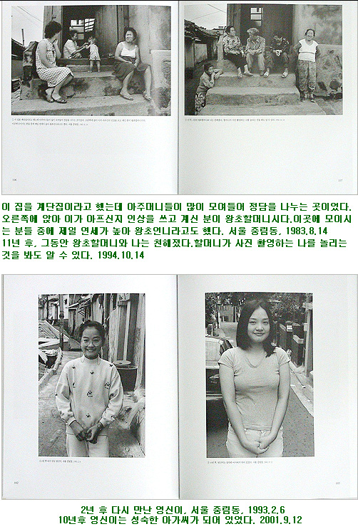 1980³â´ë ¸»ºÎÅÍ ³ªÀÇ °ñ¸ñµéÀº µµ½Ã Àç°³¹ß·Î ¹Ð·Á³ª ¹ö·È°í, 1997³âÀ» ¸¶Áö¸·À¸·Î Á߸²µ¿ °ñ¸ñ±îÁö ±× ¿î¸íÀ» ´ÙÇß´Ù. ¸ÇóÀ½ ¹«³ÊÁ® ³»¸° °ñ¸ñÀº µµÈµ¿ °ñ¸ñÀ̾ú´Ù. ¾ðÁ¨°¡ µµÈµ¿ ²À´ë±â¿¡¼ ´Ù¼¸ »ì Â¥¸® ¼Ò³âÀ» ½Ã³»¸¦ ¹è°æÀ¸·Î ÂïÀº ÀûÀÌ ÀÖ¾ú´Ù. µµÈµ¿ÀÌ ¾ø¾îÁö±â Á÷Àü ±× ¼Ò³âÀ» ½Ê³â¸¸¿¡ ´Ù½Ã ¸¸³ª °°Àº Àå¼Ò¿¡¼ ÃÔ¿µÇÏ°Ô µÈ °ÍÀÌ °è±â°¡ µÇ¾î 1990³â´ë µé¾î¿À¸é¼ºÎÅÍ ¿À·¡ Àü ÃÔ¿µÇß´ø »ç¶÷µéÀ» ¼ö¼Ò¹®ÇØ ´Ù½Ã Âï±â ½ÃÀÛÇß´Ù. ÇÏÁö¸¸ µ¿³×°¡ ¾ø¾îÁö°í »ç¶÷µéµµ »Ô»ÔÀÌ Èð¾îÁø µÚ¶ó »çÁø ÇÑ Àå µé°í ¿©±âÀú±â ¼ö¼Ò¹®ÇÑ´Ù´Â °ÍÀº À̻갡Á· ã±â¸¸ÅÀ̳ª ¾î·Á¿ü´Ù. µ¿³× ¾à±¹, ±³È¸, »§Áý, ±¸¸Û°¡°Ô, Àüö¿ª ÀÔ±¸ µî ½Ê¿©³âÀ» ã¾ÆÇì¸Ç ³¡¿¡ °Ü¿ì »ç½Ê¿© ¸íÀ» ´Ù½Ã ¸¸³¯ ¼ö ÀÖ¾ú´Ù. óÀ½ »çÁø ÀÛ¾÷À» ½ÃÀÛÇÒ ¶§ºÎÅÍ ´Ù½Ã ÂïÀ» °ÍÀ» ¿°µÎÇØ µÎ¾ú¾ú´õ¶ó¸é ÁÁ¾ÒÀ» °ÍÀ̶ó´Â ¾Æ½¬¿òÀÌ ¾øÁö ¾ÊÁö¸¸ ³» ³ª¸§´ë·Î ÃÖ¼±À» ´ÙÇÑ °Í¿¡ ¸¸Á·ÇÒ ¼ö ¹Û¿¡ ¾øÀ» °Í °°´Ù.