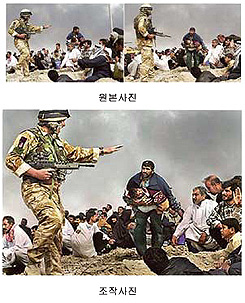 ¹®Á¦ÀÇ »çÁøÀº ¹Ù±×´Ùµå¿¡ ¹Ì¡¤¿µ±ºÀÌ ÁøÀÔÇϱâ Á÷Àü, ¹Ù½º¶ó ±Ù±³¿¡¼ ¾î¸°¾ÆÀ̸¦ ¾ÈÀº À̶óÅ© ÁÖ¹ÎÀ» ¿µ±¹±º º´»ç°¡ ¾ÈÀüÇÏ°Ô µµÇǽÃŰ´Â Àå¸éÀÌ ÂïÇôÀÖ´Â °ÍÀ̾ú´Ù. ±×·¯³ª ÀÌ »çÁø¿¡ µ¿ÀÏÇÑ À̶óÅ© ÁÖ¹ÎÀÌ µÎ ±ºµ¥¿¡ ³ª¿ÍÀÖ´Â °ÍÀÌ °ü°èÀÚ¿¡ ÀÇÇØ¼ ÁöÀûµÇ°í, °á±¹Àº ±×°ÍÀÌ ÄÄÇ»ÅÍ·Î ÇÕ¼ºµÈ »çÁøÀ̶ó´Â »ç½ÇÀÌ ÆÇ¸íµÇ¾ú´Ù. ÇÕ¼º¿¡ »ç¿ëµÈ °ÍÀº °°Àº Àå¼Ò¿¡¼ ÂïÀº µÎ ÀåÀÇ ¿¬¼Ó »çÁøÀ̾ú´Ù. ±× »çÁøÀ» º¸¸é ºÐ¸í ¹Ì¡¤¿µ±º°ú À̶óÅ© ÁֹΠ¾çÂÊÀÇ ÁÁÀº ºÎºÐ¸¸À» Â¥ ¸ÂÃß¾î ±¸µµ¿Í ¿òÁ÷ÀÓÀ» Á¶Á¤Çϰí, ¿µ±¹º´»ç¿Í ¾î¸°À̸¦ ¾È°í ¸· ÀϾ À̶óÅ©ÀÎ, ÁÖÀú¾ÉÀº ÁֹΠµî ¿ä¼ÒµéÀ» ±äÀå°¨ ³ÑÄ¡´Â ȸéÀ¸·Î ±¸¼ºÇϰí ÀÖ´Ù. Áï, ¿ø·¡ÀÇ »çÁøº¸´Ù ÇÕ¼º»çÁø ÂÊÀÌ ÈξÀ ½Ã°¢ÀûÀ¸·Î Ãæ°ÝÀÌ Å©°í ¹ÌÇÐÀûÀ¸·Îµµ ¿Ï¼ºµÇ¾î Å׸¶¿Í ¸ðƼºê¸¦ ¸íÈ®ÇÏ°Ô Ç¥ÇöÇϰí ÀÖ´Ù°í ÇÒ ¼ö ÀÖ´Ù.